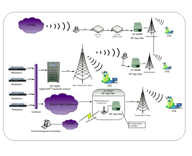 GOSPELL’s GT-5900 series UHF Terrestrial DTV Broadband Transmitters has great variety of products, and inherit the high performance, high stability and high reliability of GOSPELL branded product series. It may work in any frequency within UHF span, and the transmitting bandwidth can be up to 80MHz. In co-operation with our latest technologies of RF delay and co-channel interference rejection, this system can fulfill the needs of multi-frequency simultaneous transmission and large area coverage, especially suitable for wide coverage terrestrial DTV network in areas with complex local terrain.